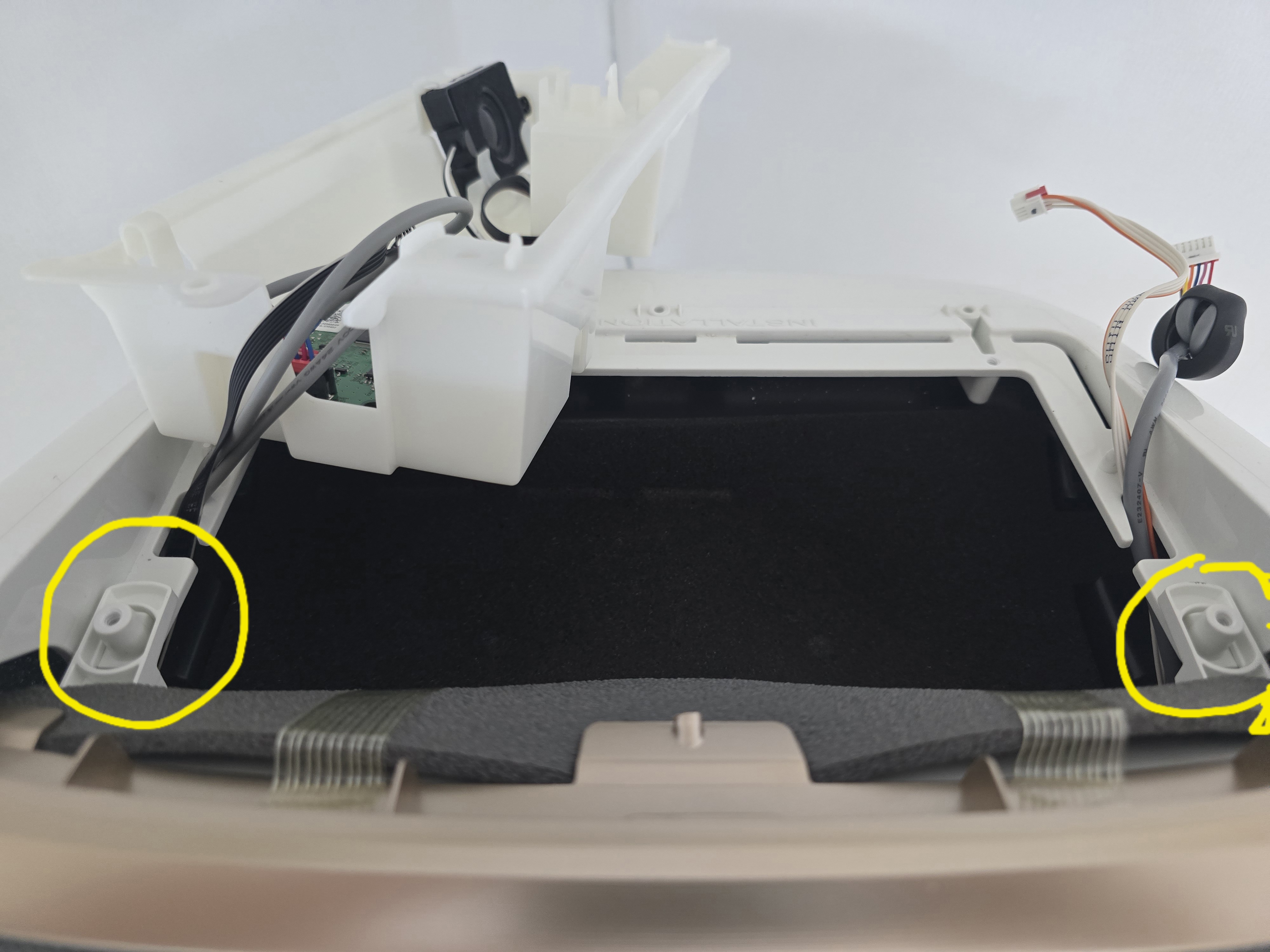 3군데 선을 뽑고 양쪽으로 펼쳐서 전면 커버 분리시 방해 되지 않도록 고정해 줍니다.