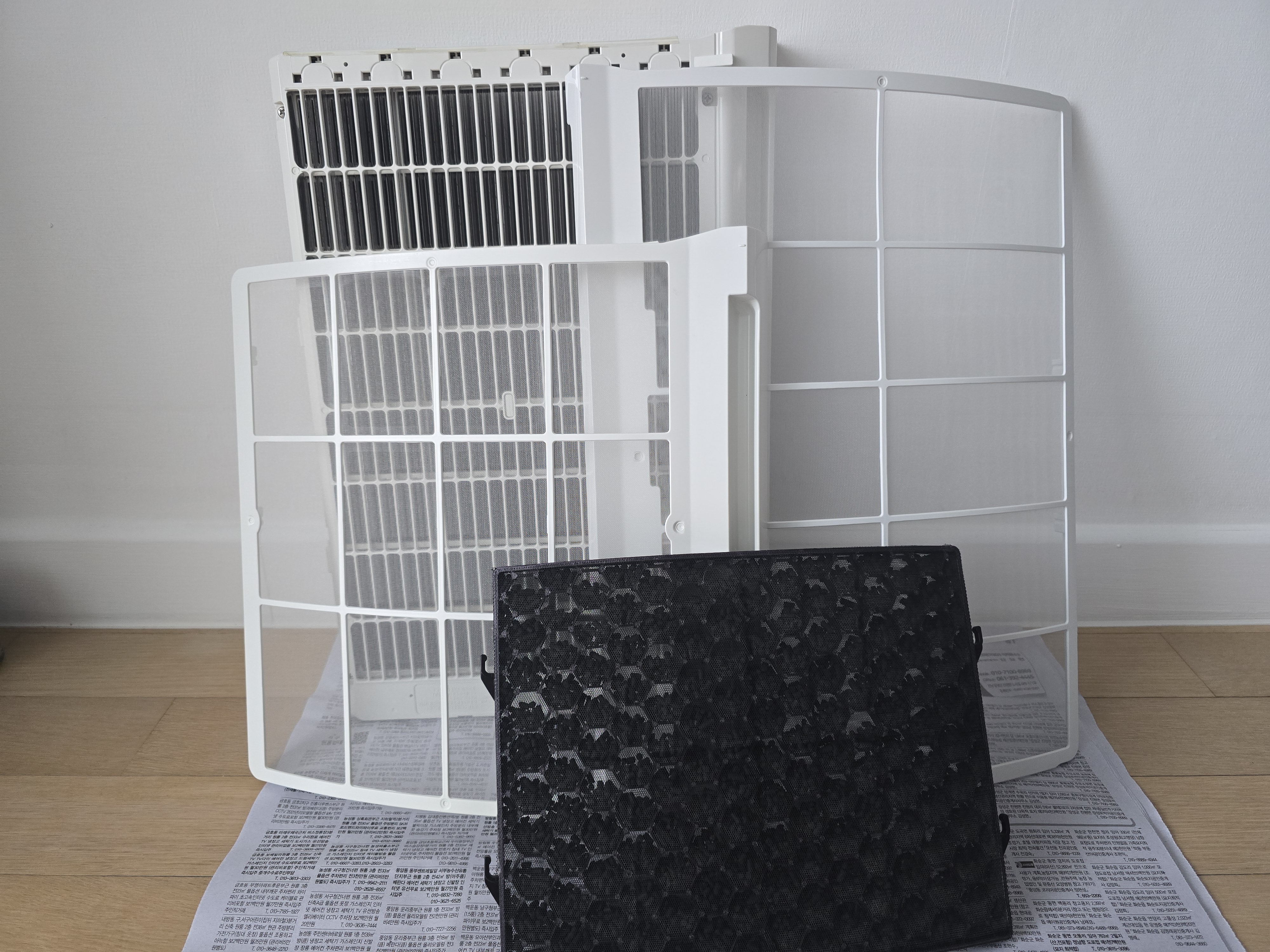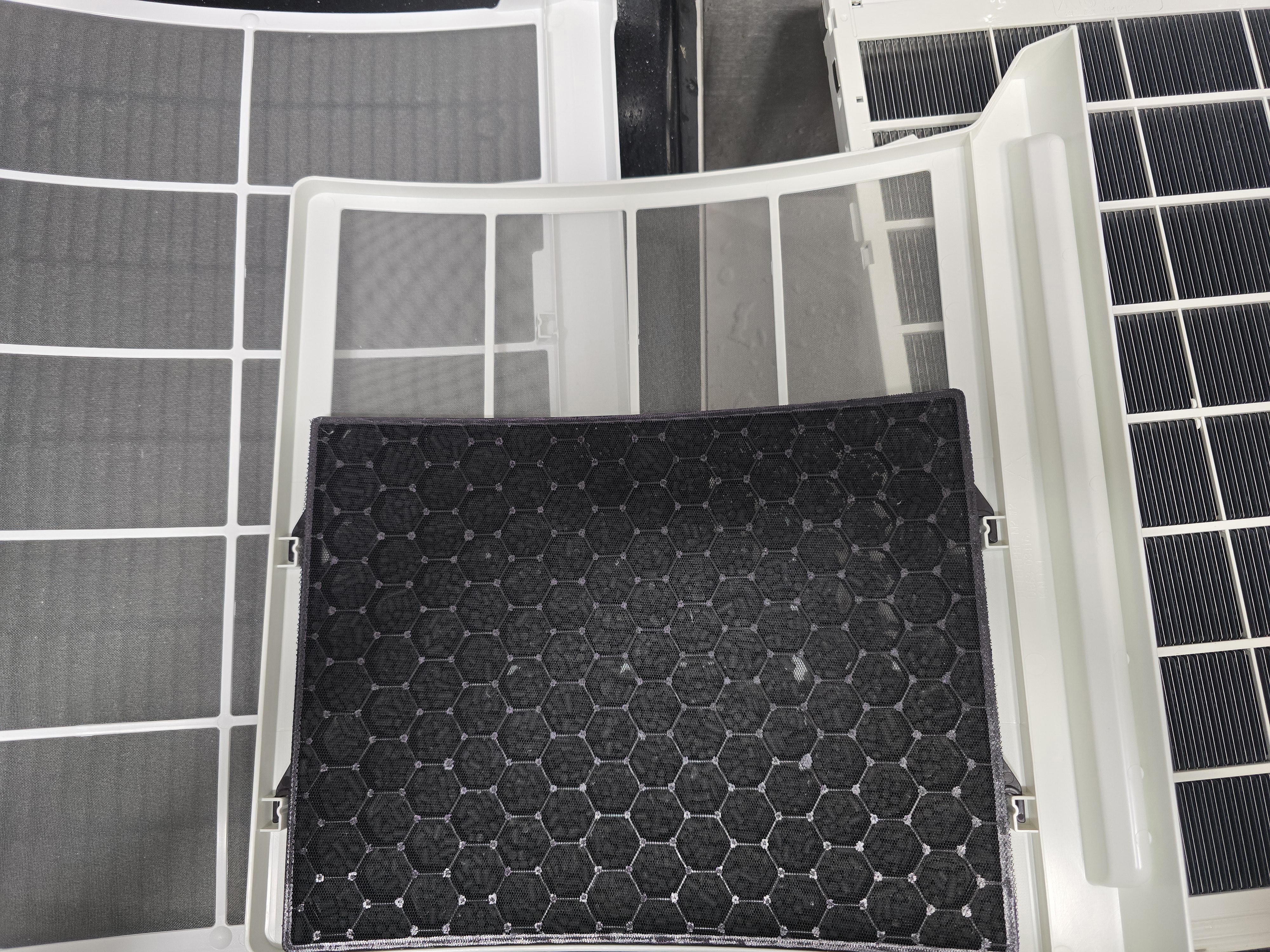 첫번째 사진보면 필터에 먼지가 하얗게 붙어 있는게 보이는데, 분리한 필터 표면의 큰먼지와 검정색 활성탄 필터의 먼지를 진공청소기로 제거해 줍니다. 검정색 필터는 청소기로만 먼지 제거를 합니다.(세척X)