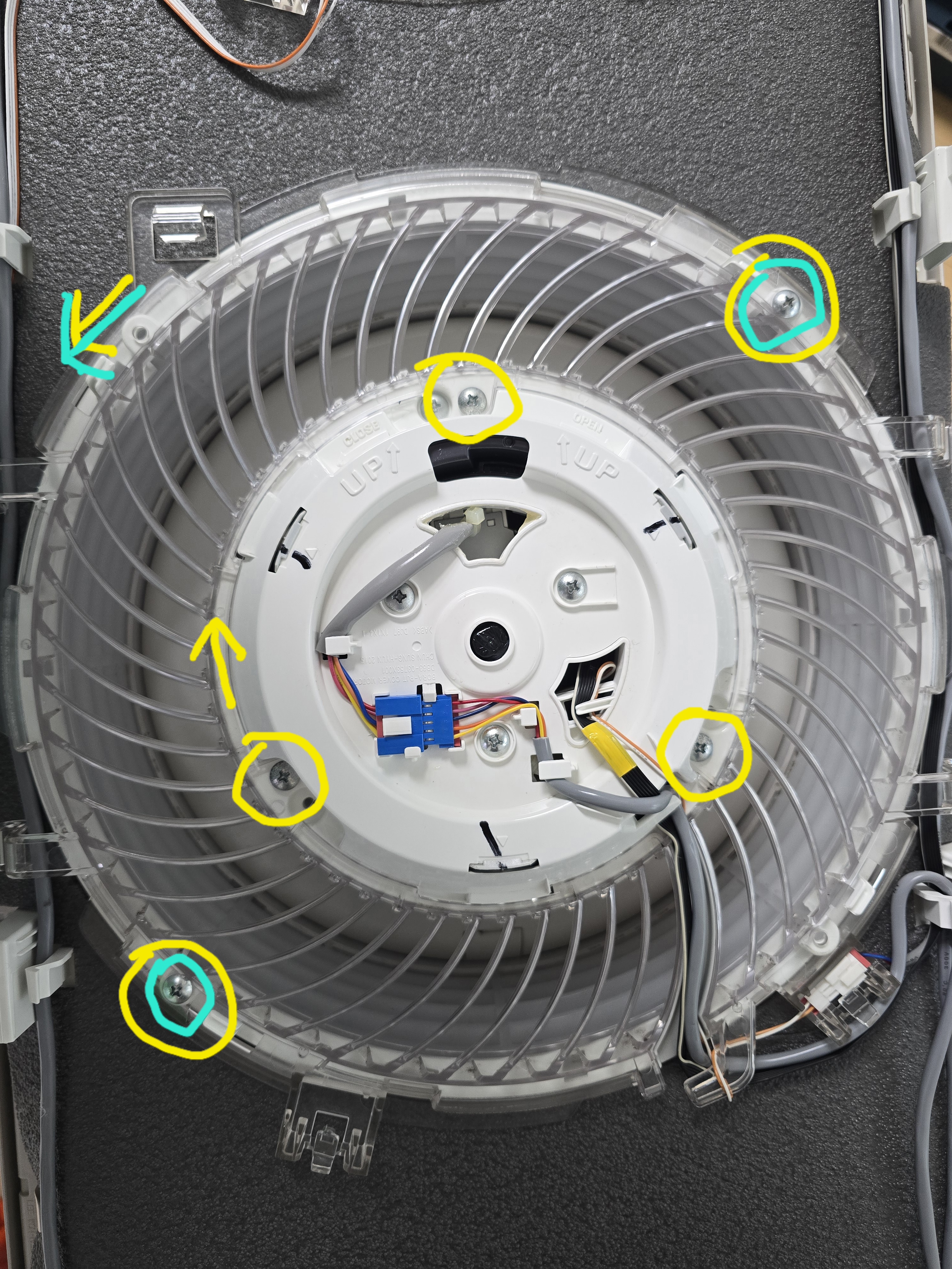몸체에 있는 송풍팬 2개를 분리 해 줍니다. 첫번째 사진 노란 동그라미에 연결되어 있는 선을 분리하고